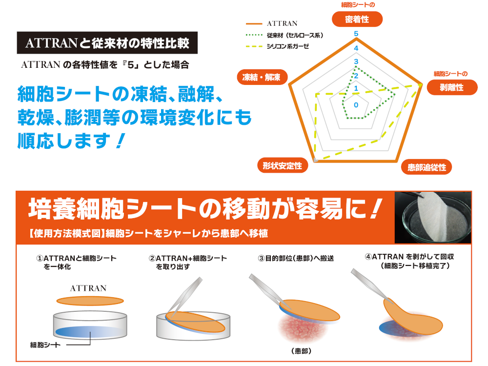 ATTRAN(アトラン)は、培養細胞シート専用に開発されたキャリア材料です。