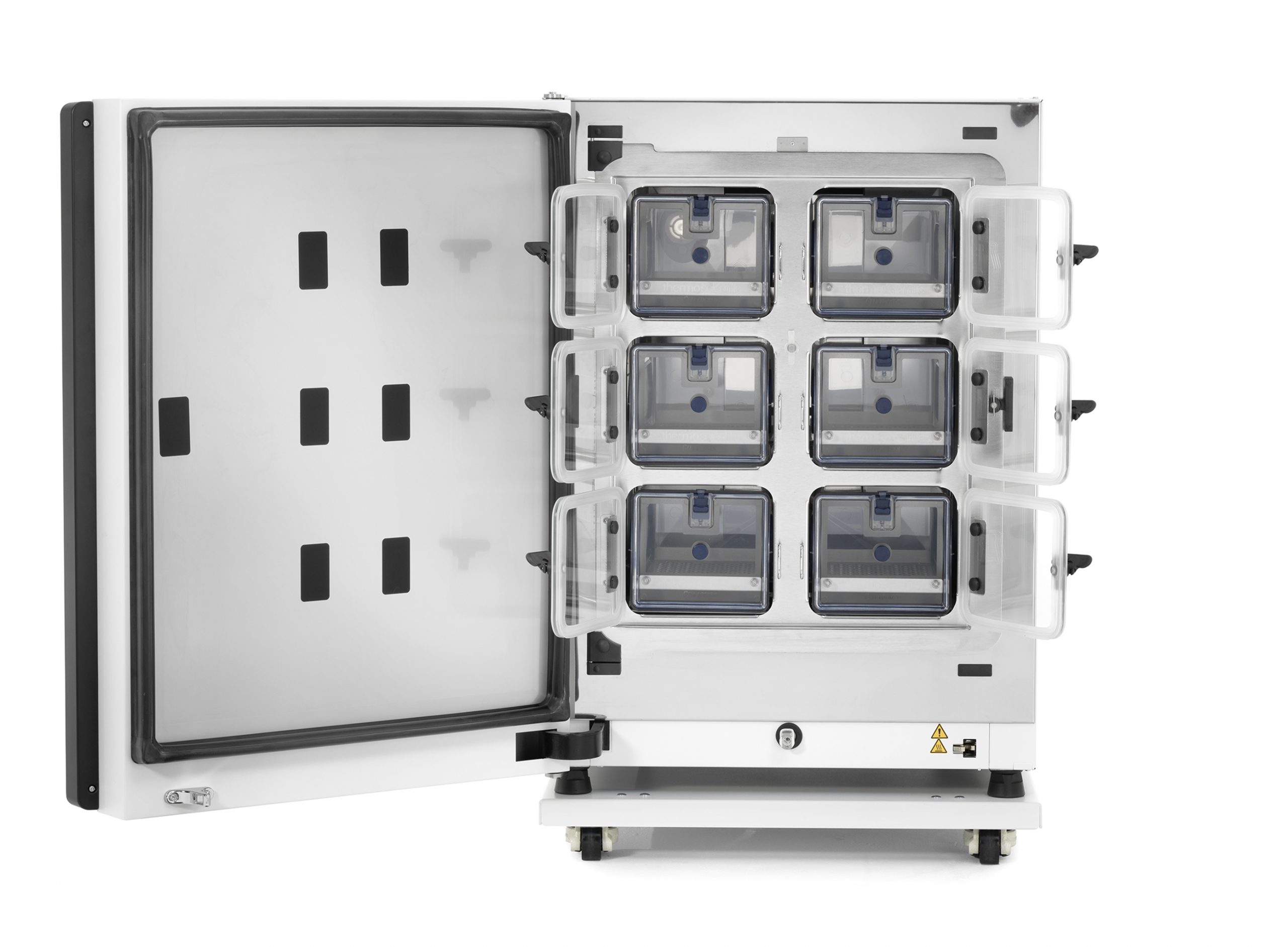Thremo Fisher Scientific社が提供するセルロッカーシステムは、6つの気密ドア、3枚の棚板を装備したVios iDx 165 CO2インキュベーターに、安定性、保護性、安全性に優れたセルロッカーを設置して使用します。セルロッカーは、環境変化に対する安定性に優れ、またコンタミネーションリスクを軽減できるため、感受性の高い幹細胞や、プライマリーセルに最適な培養環境を提供いたします。
