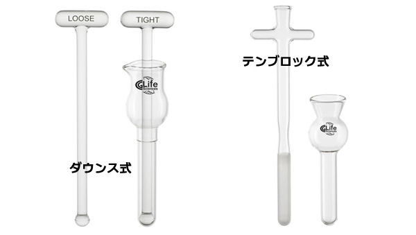 細胞膜の研究を目的としてデザインされたもので、核を壊すことなくホモジナイズすることが可能な器具です。2本のペッスルはラージクリアランスとスモールクリアランスからなり、先端は美しいガラス玉状に仕上げられています。