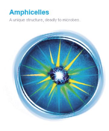 アンフィセルの構造により、濡れた場所や乾燥した場所でも変わらず除菌効果が最大に発揮され、高分子構造により懸濁液中では浮遊微生物に対して一度の接触で十分な除菌効果を示します。