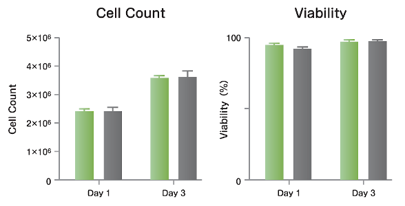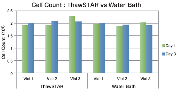 K562細胞(白血病細胞) 液体窒素での保存後、3本のチューブを一般的なウォーターバスとThawSTARを使用し、融解処理しました。細胞数と生存率を融解初日と培養3日後で比較したところ、いずれの結果においても同等の結果が得られました。