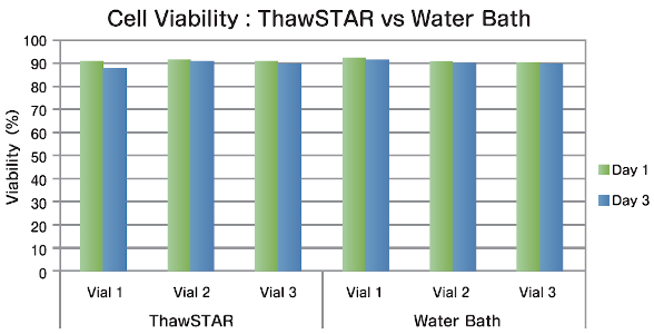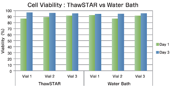 PBMC(末梢血単核細胞) 液体窒素での長期保存の後、3本のチューブを一般的なウォーターバスとThawSTARを使用し融解処理しました。生存率を融解初日と培養3日後で比較したところ、ThawSTARでの結果は従来法と同等でした。 データ提供:Blood Systems Research Institute |