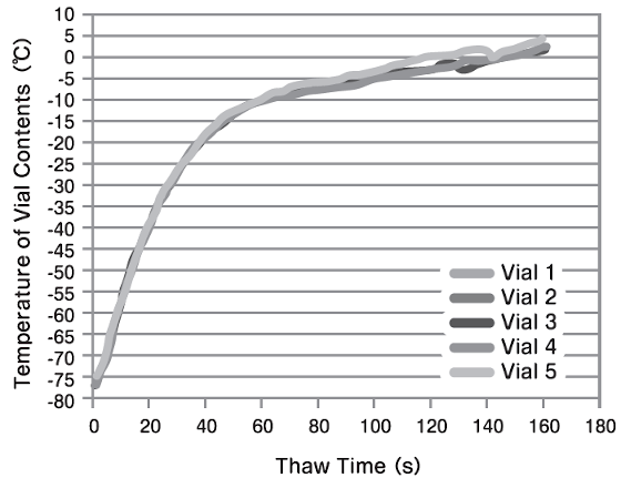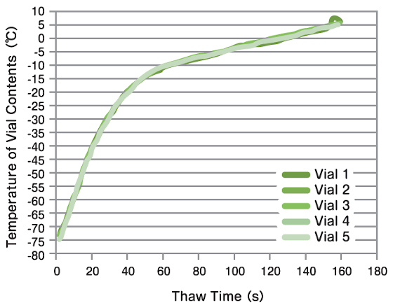 2.0mLチューブに温度センサー(熱電対)を挿入し、1.0mLの水をCoolCellを用いて-80℃で凍結保存。37℃ウォーターバスとThawSTARで融解処理(3分間)を行い、5本のチューブで再現性を比較しました。ThawSTARではウォーターバスよりも高い再現性が確認できました。