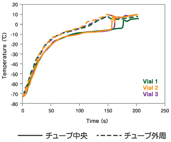 1.8mLチューブに1.0mLの凍結保存用培地(10%DMSO/20%FBS/70%DMEM)を分注し、チューブ外周(チューブ表面から0.5mm以内)とチューブ内中央部に温度センサー(熱電対)をセットしました。サンプルは-80℃で凍結させた後、ドライアイスで温度を維持し、ThawSTARにて融解処理を行いました。融解が完了しチューブがイジェクトされた際には、小豆サイズの小さな氷が見られました。