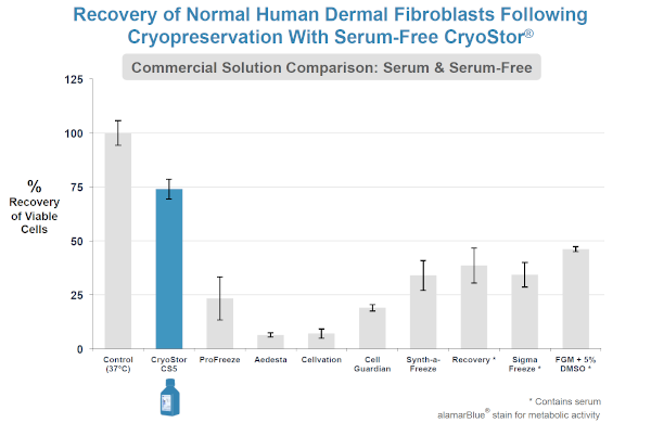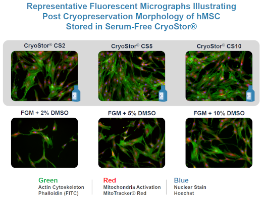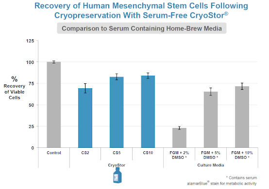 CryoStorは、市販培地+DMSO製剤よりも高い生存率、細胞内活性を示しました。CryoStorをご使用いただくメリットは、生存率の高さに加え、最高グレードのDMSOを使用しており、品質が高いことも挙げられます。