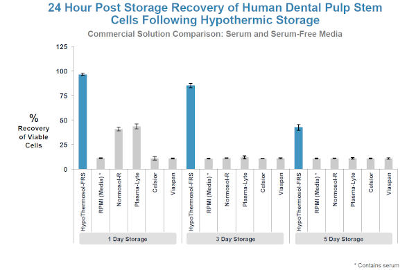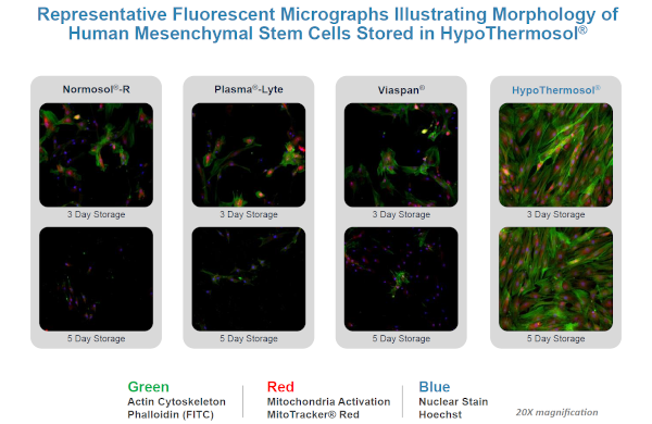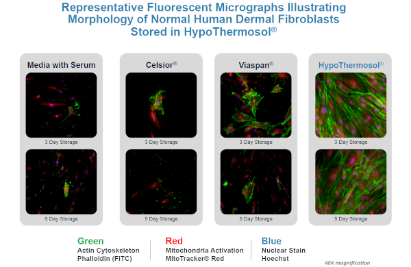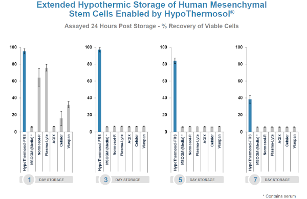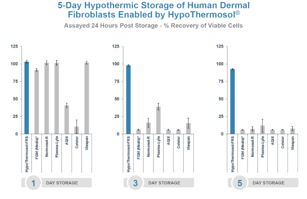 ヒト皮膚繊維芽細胞(hDF)、ヒト間葉系幹細胞(hMSC)、ヒト歯髄幹細胞(hDPSC)の冷蔵保存時の生存率および細胞内活性を比較しています。HypoThermosolを使用すると、低温での保管で非常に生存率が高く維持できていることが分かります。この結果から、HypoThermosolは低温輸送に有用であることが分かります。