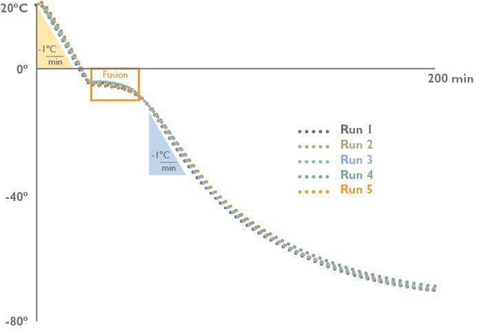 CoolCellを-80°Cのフリーザーに入れると、内部のすべての凍結チューブ(バイアル)は-1°C /分の速度で冷却されます。