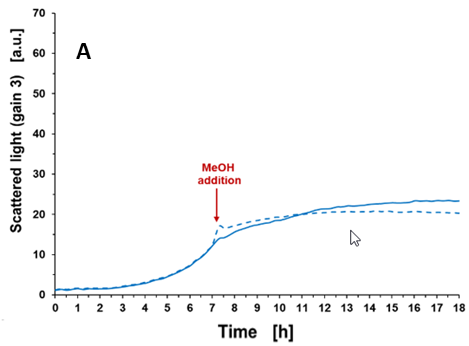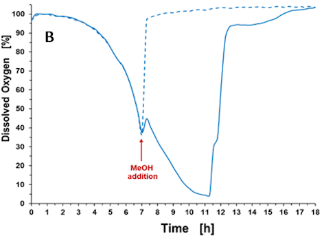 E.coli BL21 wild typeをWilms-MOPS培地(10g/Lグリセロール)でバッチ培養 最終濃度9%(v/v)、27%(v/v)としてメタノールを添加