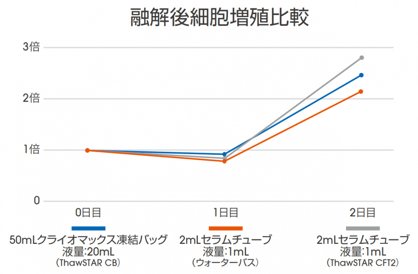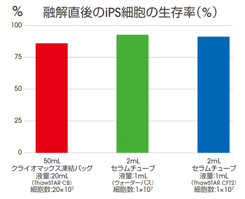 また、大容量の凍結細胞を融解する際には細胞生存率の低下が一つの課題となります。弊社は慶応義塾大学医学部の遠山周吾先生にご協力いただき、クライオマックス凍結保存バッグとThawSTAR CBを使用した場合の細胞生存率を測定しました。