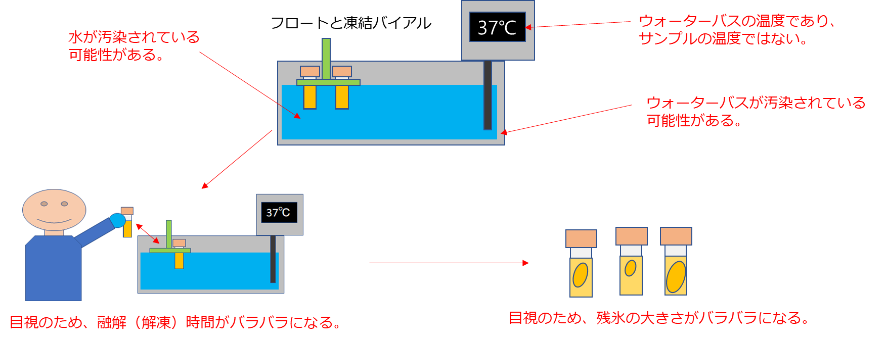 さらに、ウォーターバスを用いた融解はヒトの手技や主観による作業が多く、標準化が難しいとされています。