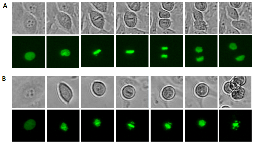 この実験では、細胞分裂プロセスをモニタリングし、がん細胞株に対するノコダゾールの有糸分裂阻害効果を試験しました。このため、細胞周期における染色体構造の動きを視覚化できるよう、緑色蛍光タンパク(GFP)を融合したヒストン2B(H2B-GFP)をHeLa細胞にトランスフェクトしました5。その後、細胞に対してノコダゾール処理を行い、ライブセルイメージングシステムである、Celloger® Mini Plusを用いて細胞分裂をモニタリングしました。