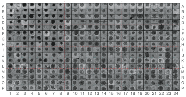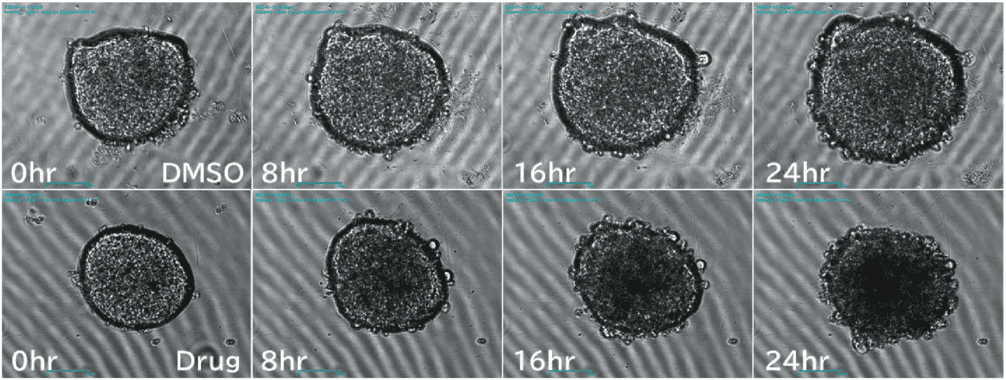 384マルチウェルプレートのすべてのウェルについて鮮明な画像を得ることができた(結果1)。4回のタイムラプス撮影の間、それぞれのオルガノイドのズレや移動はほぼ確認されなかった。このためサイズの増大や光透過性の変化を精密に比較することができた(結果2)。がんオルガノイドは大きさを揃えて調整することが難しいため、安定に再現よく撮影できることは解析結果の精度の向上に強く貢献する。