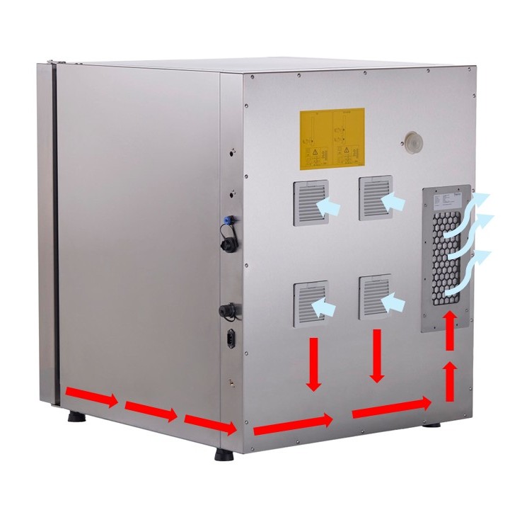 装置は密閉型構造で、バキュームシステムにより空気は背面フィルターを介して装置内に取り込まれ、排出時はHEPAフィルターを通って室内に放出されます。これにより、室内への不要な粒子の排出を防止します。