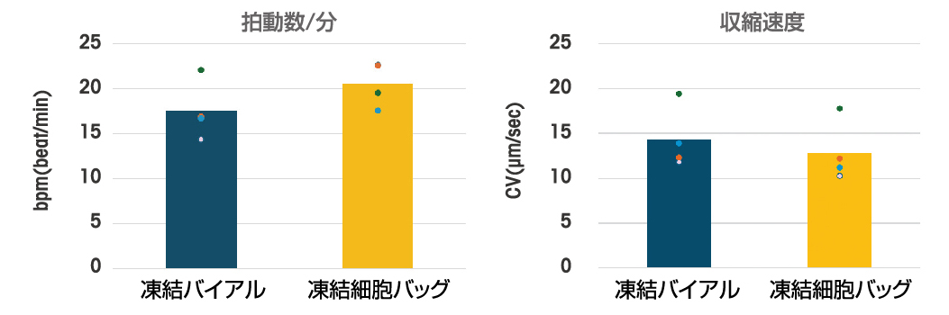 4日培養後の拍動数/分と収縮速度を測定した結果、心筋細胞は、バイアルでも凍結バッグでも安定した拍動を示した。