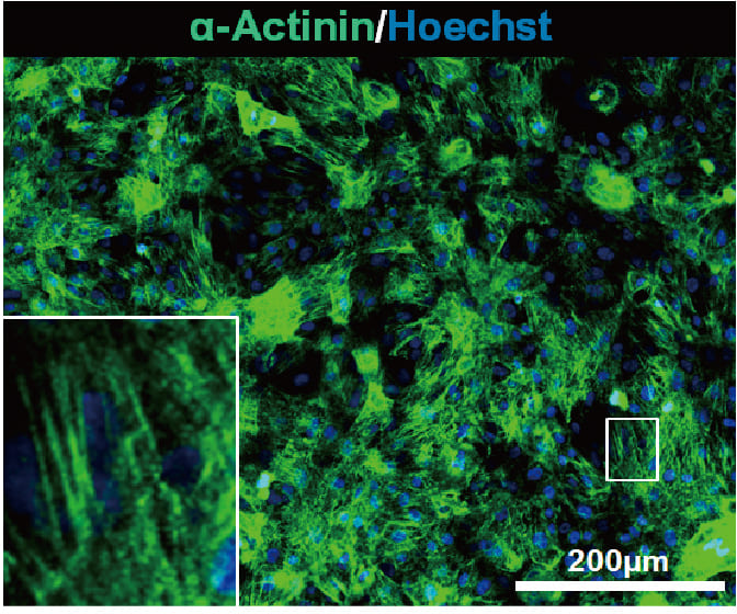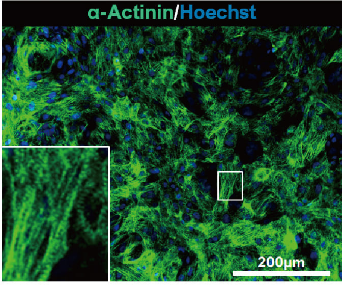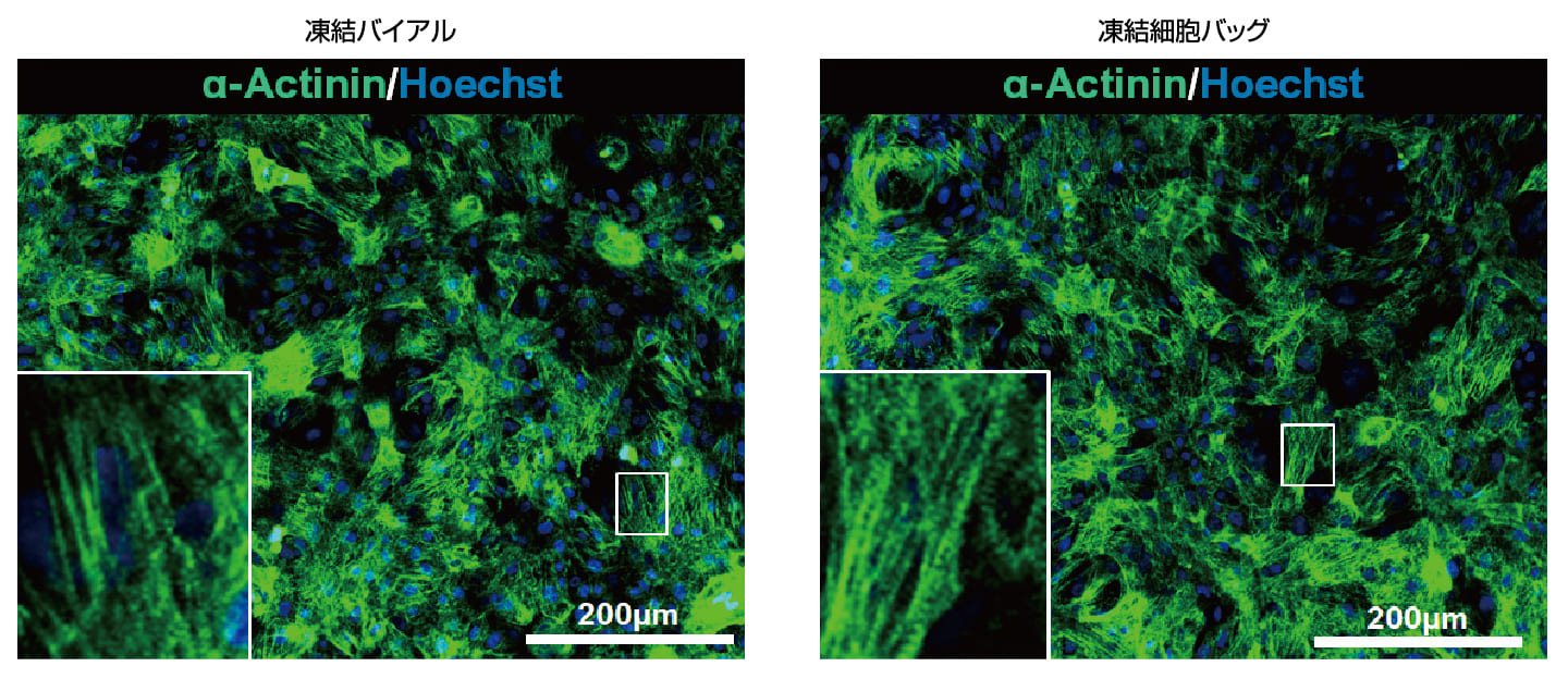凍結バッグ解凍後の心筋細胞の接着性とα-Actininの発現は、バイアルと同等であることを確認した。