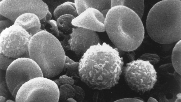造血幹細胞から作られた様々なタイプの血液細胞の、電子顕微鏡画像。 (出典:National Cancer Institute)