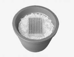 | 氷上で直接冷却する現行法 組織培養プレートを典型的なアイスバケツに入れた氷の上に置くと、クラッシュアイスの中には不均一な断熱性エアポケットがあるため、ECMの温度が不均一になります。加えて、氷とそれが融解した水には微生物が存在するため、コンタミネーションリスクも高くなります。 |