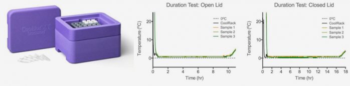 (左)CoolBox XTにセットした微量遠心チューブ。(中)蓋を開けた場合は10時間まで、(右)蓋を閉めた場合16時間以上サンプル温度は均一に1℃近くに保たれる。